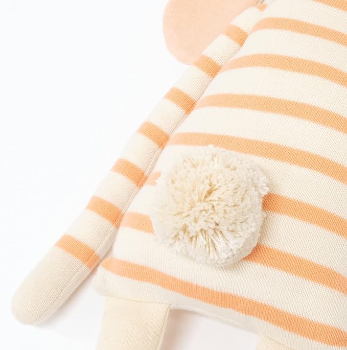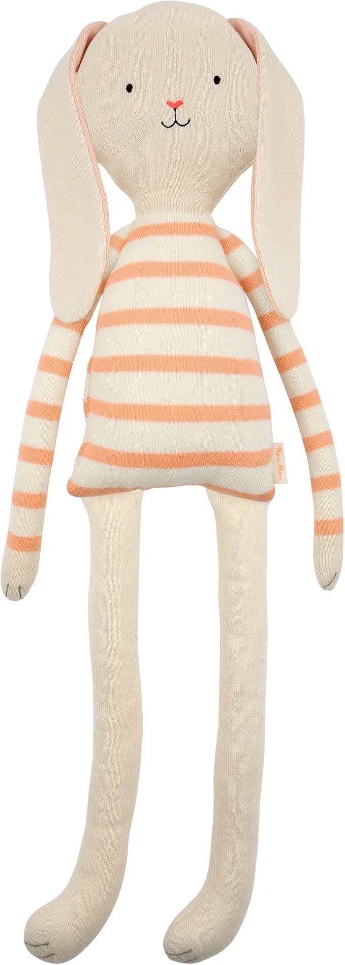 Gestrickter Hase von Meri Meri aus feinster Bio Baumwolle. Sehr groß. Dieses Kuscheltier ist ein echter Hingucker. Er trägt ein Streifenoutfit und hat herrlich große, zweifarbige Schlappohren und hinten einen Pompon als Schwänzchen. Handgefertigt in einer Manufaktur in Californien