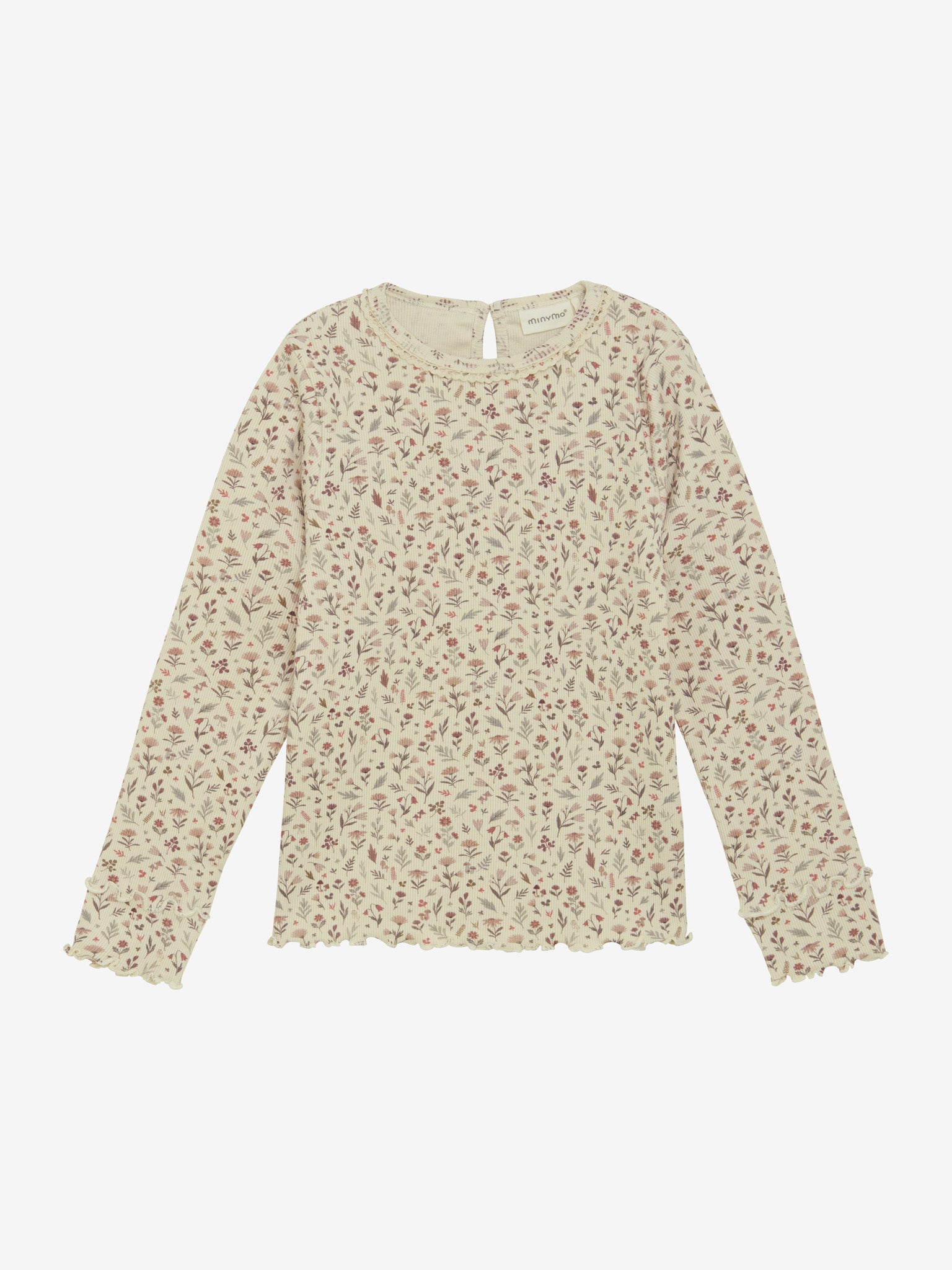 Schönes Langarm-Shirt aus Baumwoll-Rips mit einem zarten all-over Blütenprint und dekorativen Stickerei-Kanten am Kragen und den Ärmelaufschlägen.