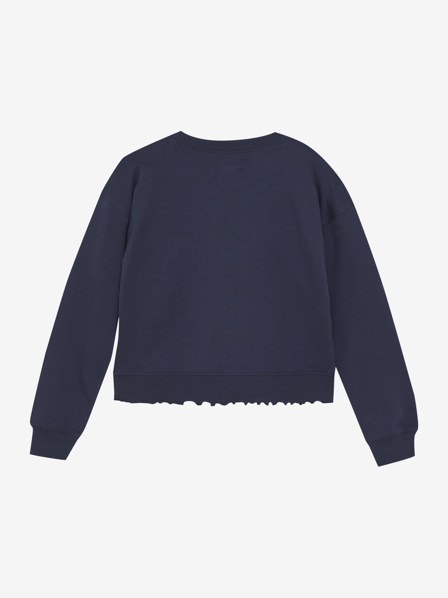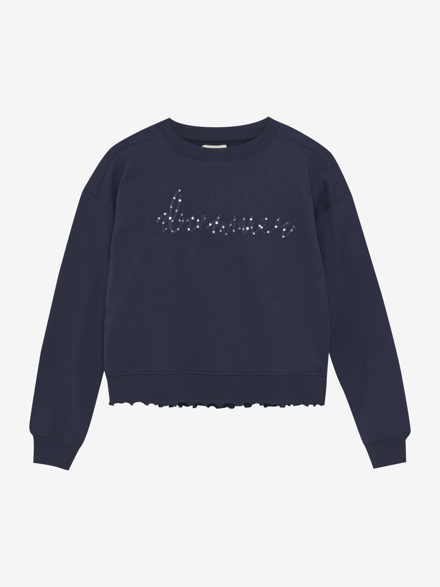 Wunderschönes Sweatshirt mit tollen Details: das kurgeschnittene Oberteil hat am unteren Bündchen eine Wellenkante und vorn einen applizierten, mit Pailletten verzierten Schriftzug "dreamer". Der dunkelblaue Sweater lässt sich vielfältig kombinieren und passt zu Jeans genauso gut wie zu Röcken oder über ein Kleid.